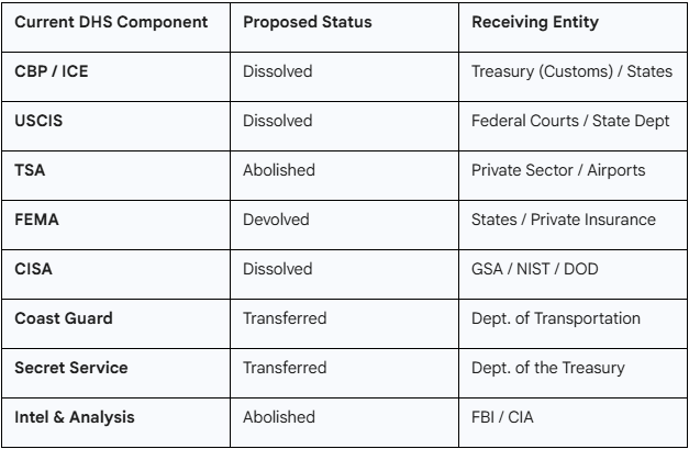 Each major component of the DHS is slated for abolition or transfer based on historical and functional logic: